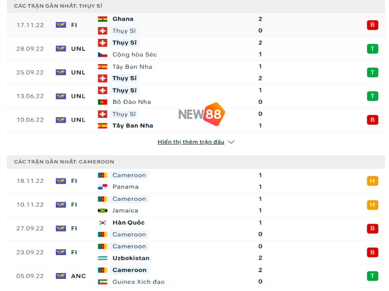 Phong độ 2 đội tuyển Thụy Sỹ vs Cameroon