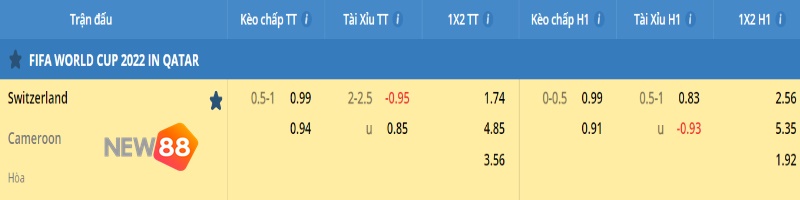 Thụy Sỹ vs Cameroon sẽ cạnh tranh nhau cho một chiếc vé đi tiếp vào vòng 16 đội ở vòng bảng World Cup 2022. Họ sẽ phải rất cố gắng bởi vì bảng đấu này có sự xuất hiện của Brazil, đội tuyển dường như chắc một xuất đi tiếp ở vòng này. Cùng New88 đi vào phân tích các kèo cược và phong độ 2 đội nhé.