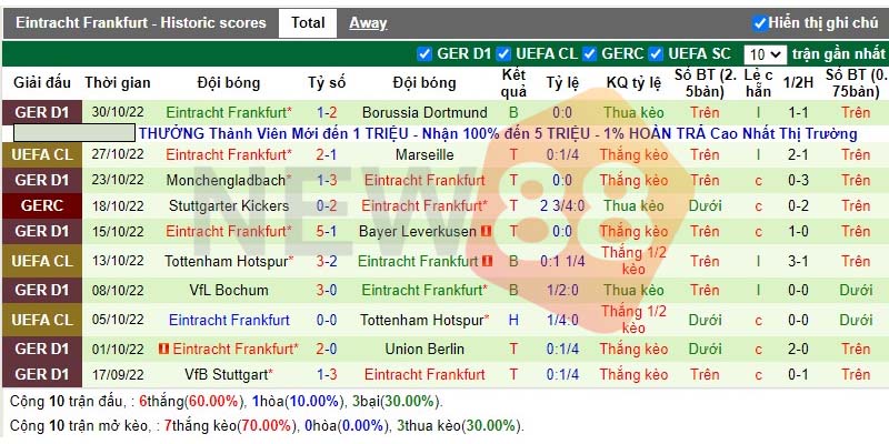 Trong chuỗi 10 trận gần nhất, Eintracht Frankfurt đã thắng 6, hòa 1 và có 3 trận thua.