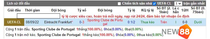 Lần gặp gần đây, Sporting thắng Eintracht Frankfurt vơi tỷ số 3-0.