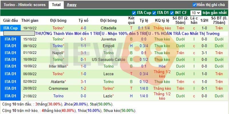 Bên phía Torino là 6 trận thắng kèo và 3 trận thua kèo.