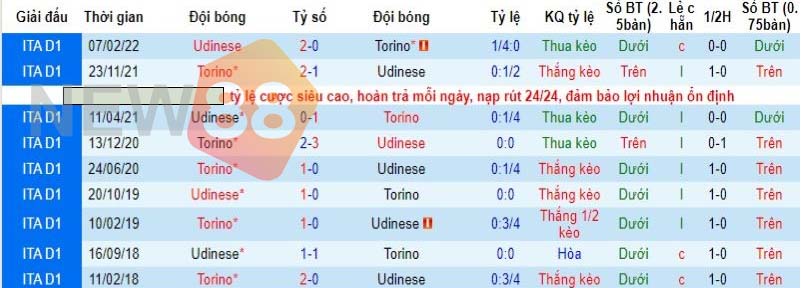 10 lần gặp gần đây, Udinese thắng 8, hòa 1 và 1 lần thất bại trước Torino