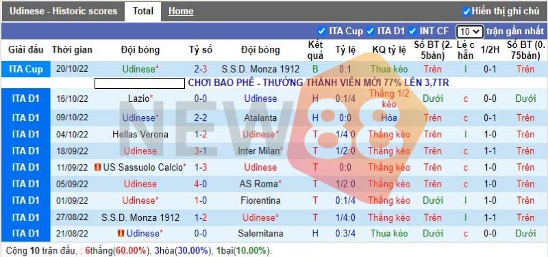 10 trận đấu gần đây, Udinese đã thắng 6, hòa 2 và có 2 trận mất điểm.